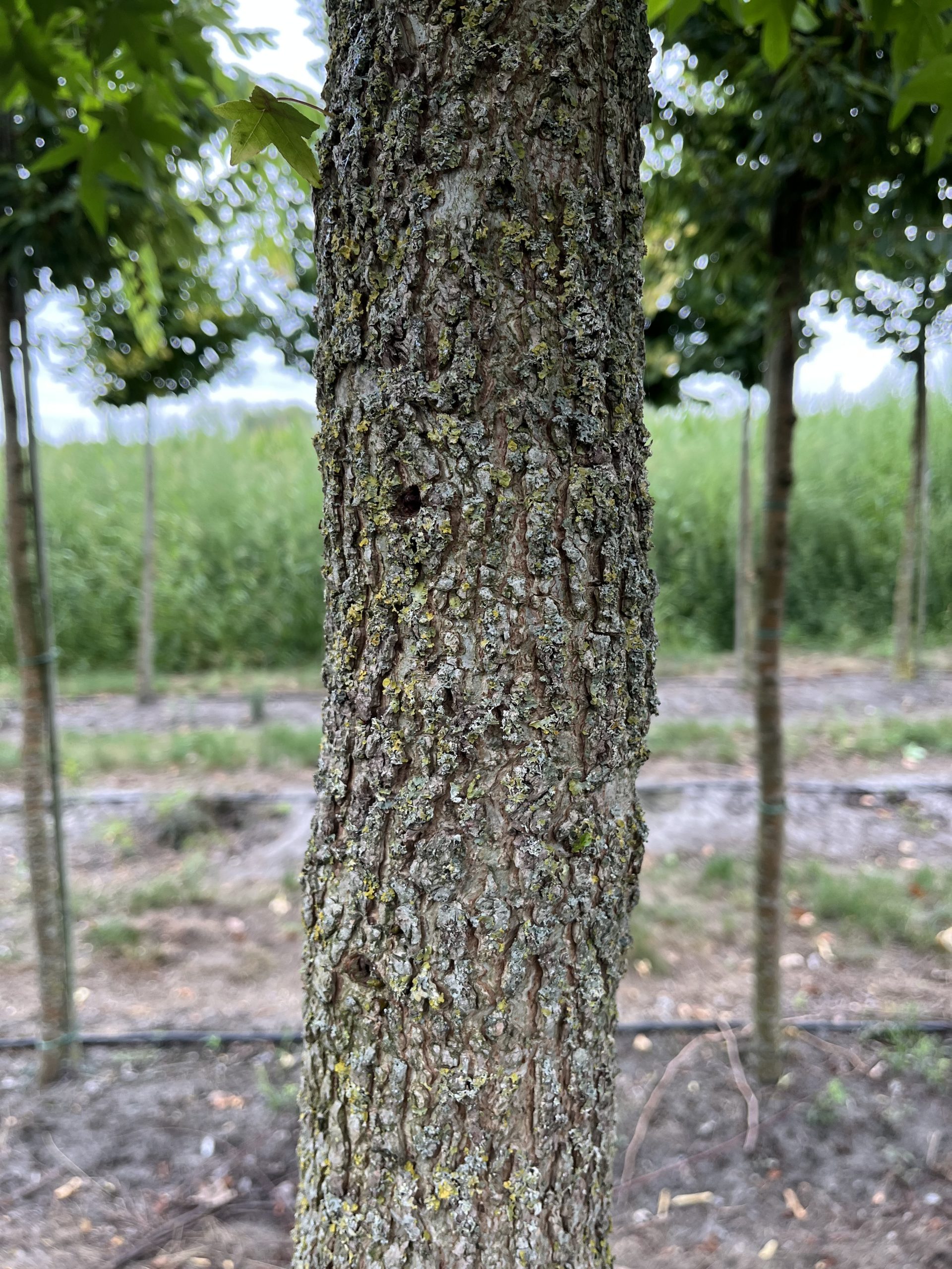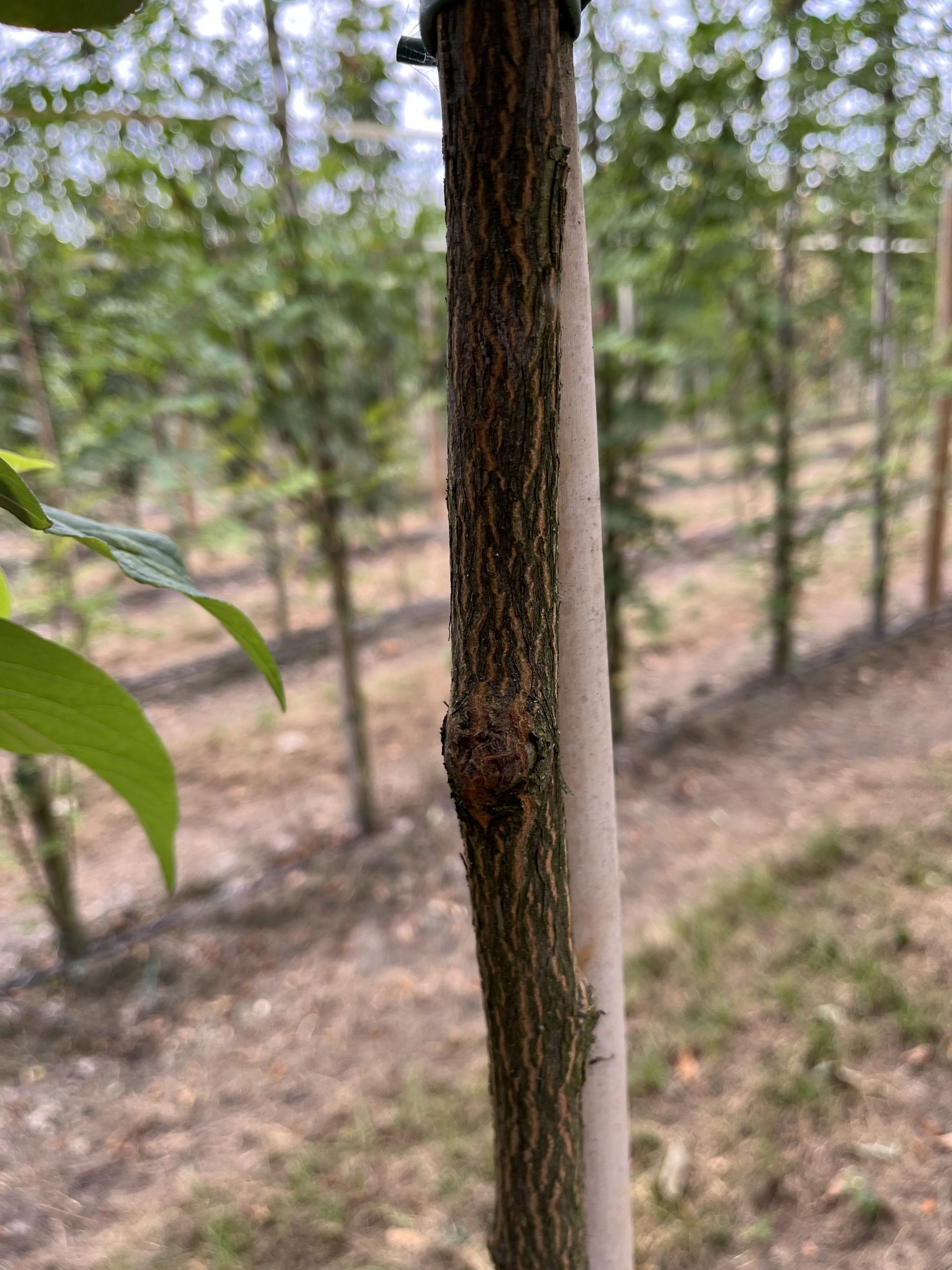 8; aan de stam van een boom met blote wortel is een duidelijke verkleuring te zien van het deel wat boven de grond moet zitten. Plant de boom niet dieper!
